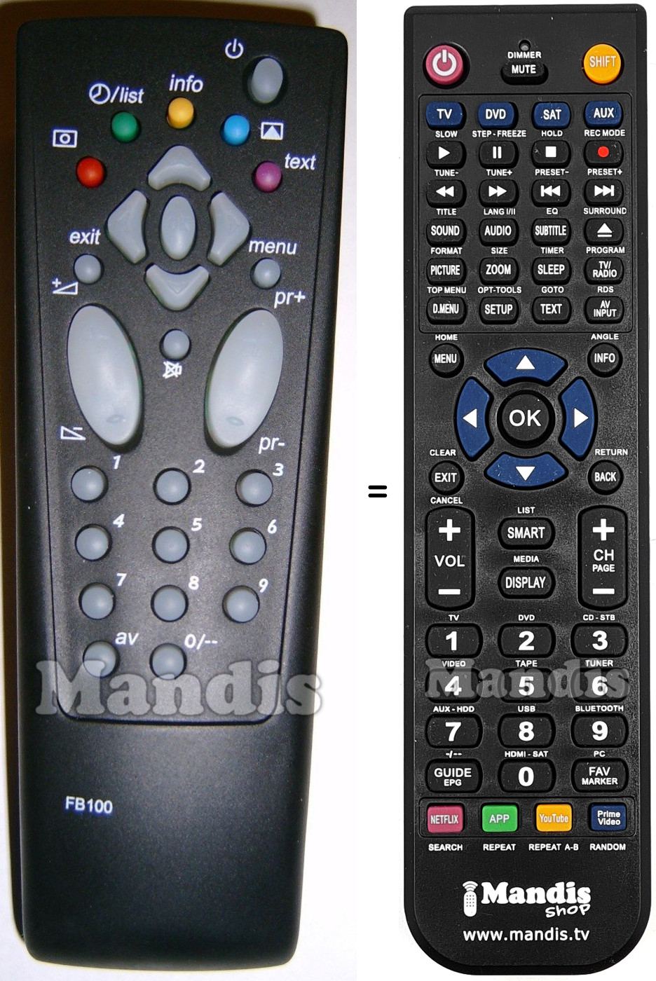 A continuació, us mostrarem la correspondència entre cada un dels botons del comandament original i el botó que realitza la mateixa funció en el comandament de substitució. En alguns casos, és possible que necessiti prémer la tecla SHIFT abans de prémer un altre botó per realitzar certes accions. Aquestes funcions addicionals sovint no s'utilitzen gaire i s'inclouen per facilitar la comprensió del comandament de substitució, o perquè el comandament original té més botons que el seu equivalent.