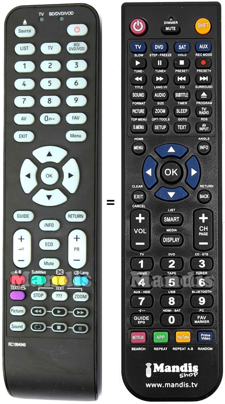 Aquest comandament a distància substitueix completament el teu RC 1994946 (04TCLTEL0207) en totes les seves funcions. No és un comandament universal, sinó una còpia exacta del teu original.