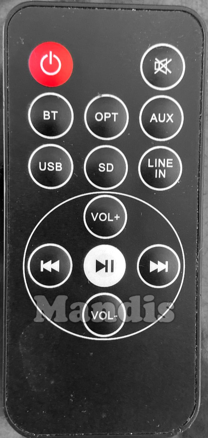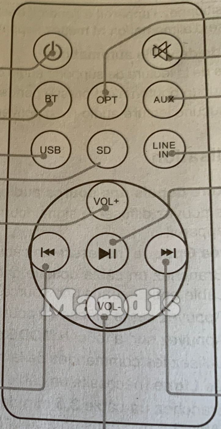Power, Mute, BT, OPT, AUX, USB, SD, Line In, Vol+, Vol-, >>I, I<<, Play / Pause