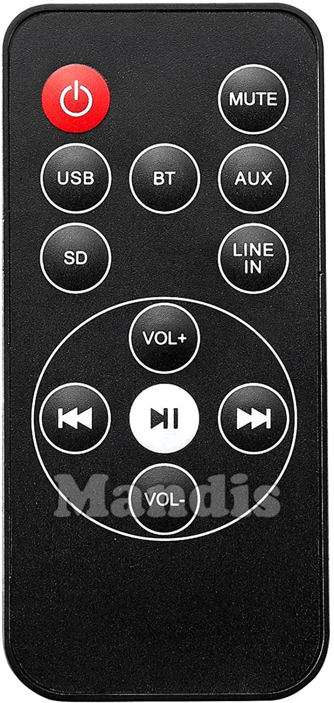 Power, Mute, USB, BT, AUX, SD, Line In, Vol+, Vol-, >>I, I<<, Play/Pause