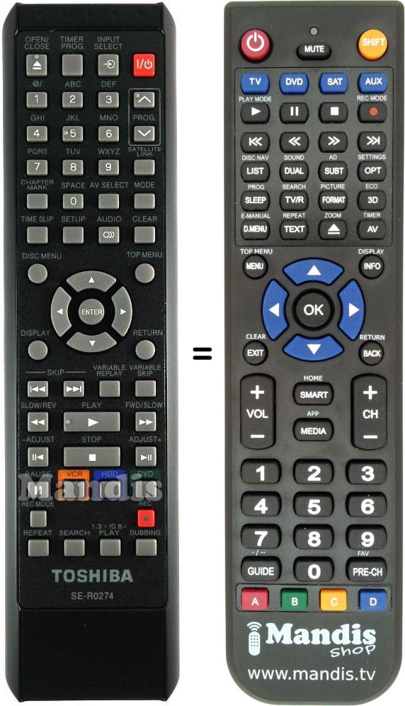 A continuació, us mostrarem la correspondència entre cada un dels botons del comandament original i el botó que realitza la mateixa funció en el comandament de substitució. En alguns casos, és possible que necessiti prémer la tecla SHIFT abans de prémer un altre botó per realitzar certes accions. Aquestes funcions addicionals sovint no s'utilitzen gaire i s'inclouen per facilitar la comprensió del comandament de substitució, o perquè el comandament original té més botons que el seu equivalent.