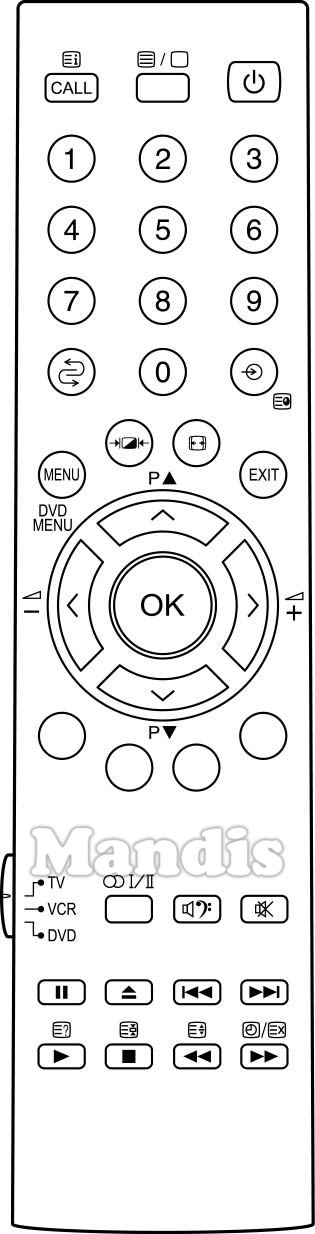 Power, Text / Display, Call / Index, 1, 2, 3, 4, 5, 6, 7, 8, 9, 0, Recall, Input, Menu / DVD Menu, →| [ / ] |←, Aspect, Exit, Up / P +, Down / P -, Left / Vol -, Right / Vol +, OK, Red, Green, Yellow, Blue, I / II, Audio, Mute, Pause, Eject, I<<, >>I, Play / Reveal, Stop / Hold, << / Size, >> / [◴] / [≡X]