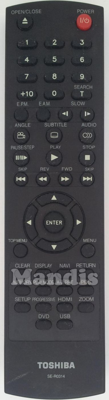 Open/Close, Power, 1, 2, 3, 4, 5, 6, 7, 8, 9, 0, +10, T/Search, EPM, EAM, <I Slow, Slow I>, Camera/Angle, [...]/Subtitle, O)))/Audio, Pause/Step, Play, Stop, I<< Skip, <</REV, FWD/>>, Skip >>I, Up, Down, Left, Right, Enter, Top Menu, Menu, Clear, Display, Navi, Return, Memory, Play Mode, A-B RPT, PBC, Setup, Progressive, HDMI, Zoom, DVD, USB