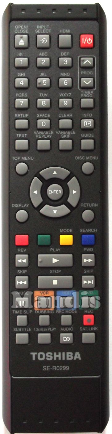 POWER, HDMI, INPUT SELECT, OPEN/CLOSE, 1, 2, 3, 4, 5, 6, 7, 8, 9, 0, SETUP, CLEAR, TEXT, VARIABLE REPLAY, VARIABLE SKIP, PROG+, PROG-, TIMER PROG, INFO, GUIDE, TOP MENU, DISC MENU , DISPLAY, RETURN, ENTER, UP, DOWN, RIGHT, LEFT, RED, GREEN, YELLOW/MODE, BLUE/SEARCH, <<, >>, I<<, >>I, PLAY, STOP, PAUSE, VCR, HDD, DVD, TIME SLIP, DUBBING , REC MODE, REC, SUBTITLE, 1.3x/0.8x PLay, O))/Audio, Sat Link
