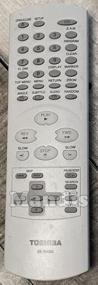 Power, Open / Close, Setup, E.A.M., Program, Clear, 1, 2, 3, 4, 5, 6, 7, 8, 9, 0, FL Dim, Display, Marker, Top Menu, Menu, Return, Zoom, Angle, Subtitle, Audio, Random, Play, << Rev, Fwd >>, Stop, <I Slow, Slow I>, I<< Skip, Skip >>I, Pause / Step, Search, A-B Rpt, Repeat, Up, Left, Enter, Right, Down