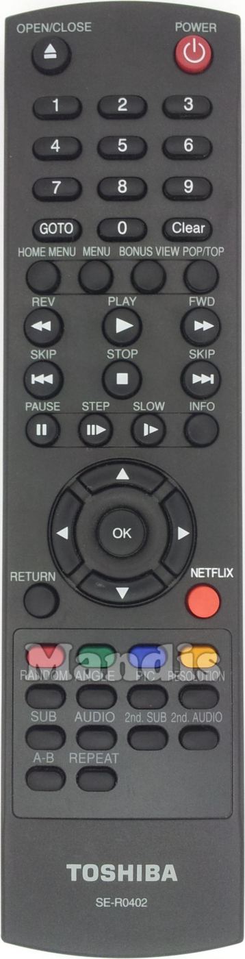 Power, Open/Close, 1, 2, 3, 4, 5, 6, 7, 8, 9, 0, Goto, Clear, Home Menu, Menu, Bonus View, POP/TOP, <<, Play, >>, I<<, Stop, >>I, Pause, Step, Slow, Info, Return, Netflix, Up, Down, Right, Left, OK, Red, Green, Blue, Yellow, Random, Angle, PIC, Resolution, SUB, Audio, 2nd SUB, 2nd Audio, A-B, Repeat