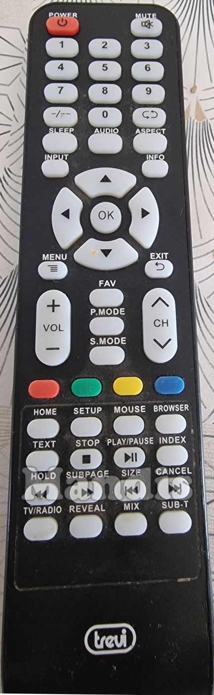 Comandament a distància original TRE002 que serveix per televisors de la marca Trevi. Es tracta d'un model original de comandament a distància.