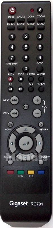 Comandament a distància original Gigaset-RC791 (RC791) que serveix per disc dur multimèdia de la marca Tv Tech. Es tracta d'un model original de comandament a distància.