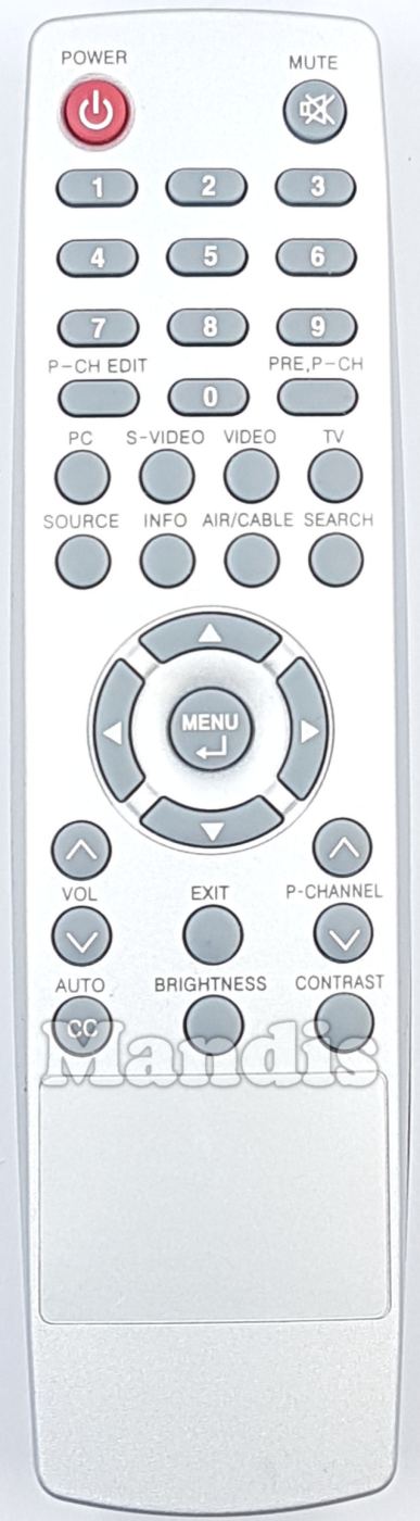 Power, Mute, 1, 2, 3, 4, 5, 6, 7, 8, 9, 0, P-CH Edit, PRE.P-CH, PC, S-Video, Video, TV, Source, Info, Air/Cable, Search, Vol+, Vol-, Exit, P-Channel+, P-Channel-, Enter/Menu, Up, Down, Right, Left, CC/Auto, Brightness, Contrast