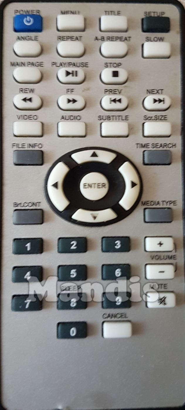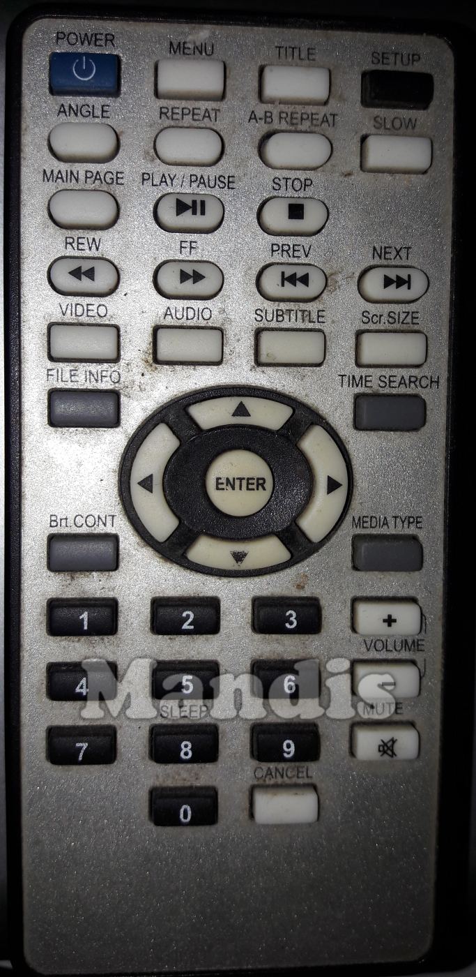 Power, Menu, Title, Setup, Angle, Repeat, A-B Repeat, Slow, Main Page, Play / Pause, Stop, << REW, >> FF, I<< Prev, >>I Next, Video, Audio, Subtitle, Scr. Size, File Info, Time Search, Brt. Cont, Media Type, Up, Left, Enter, Right, Down, 1, 2, 3, 4, 5, 6, 7, 8, 9, 0 / Sleep, Cancel, Volume+, Volume-, Mute