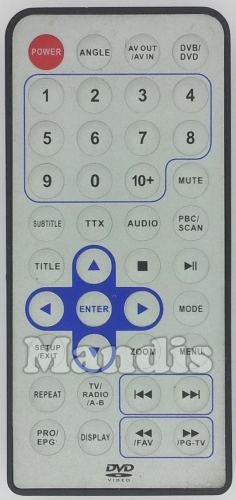 Power, Angle, AV Out/AV In, DVB/DVD, 1, 2, 3, 4, 5, 6, 7, 8, 9, 0, 10+, Mute, Subtitle, TTX, Audio, PBC/Scan, Title, Up, Stop, Play/Pause, Left, Enter, Right, Mode, Setup/Exit, Down, Zoom, Menu, Repeat, TV/Radio/A-B, I<<, >>I, Pro/EPG, Display, <</FAV, >>/PG-TV