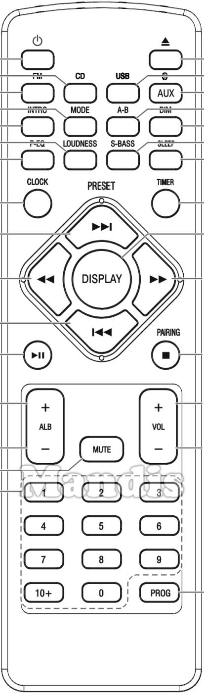 Power, Eject, FM, CD, USB, AUX / Bluetooth, Intro, Mode, A-B, DIM, P-EQ, Loudness, S-BASS, Sleep, Clock, Timer, Up / >>I / Preset +, Down / I<< / Preset -, Right / >>, Left / <<, Display, Play / Pause, Stop / Pairing, ALB +, ALB -, Mute, Vol +, Vol -, 1, 2, 3, 4, 5, 6, 7, 8, 9, 0, 10+, Prog