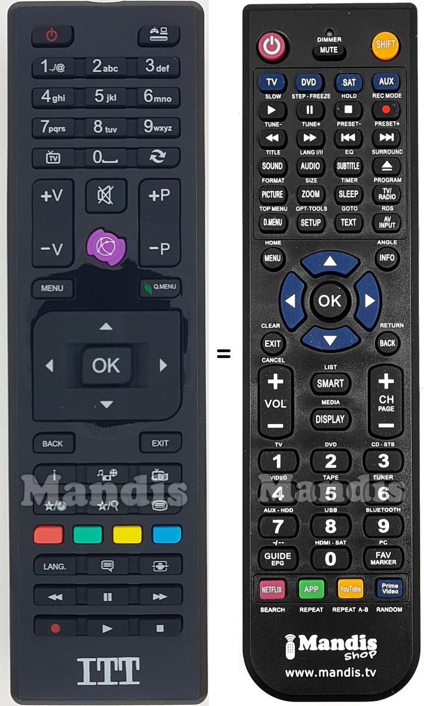 A continuació, us mostrarem la correspondència entre cada un dels botons del comandament original i el botó que realitza la mateixa funció en el comandament de substitució. En alguns casos, és possible que necessiti prémer la tecla SHIFT abans de prémer un altre botó per realitzar certes accions. Aquestes funcions addicionals sovint no s'utilitzen gaire i s'inclouen per facilitar la comprensió del comandament de substitució, o perquè el comandament original té més botons que el seu equivalent.