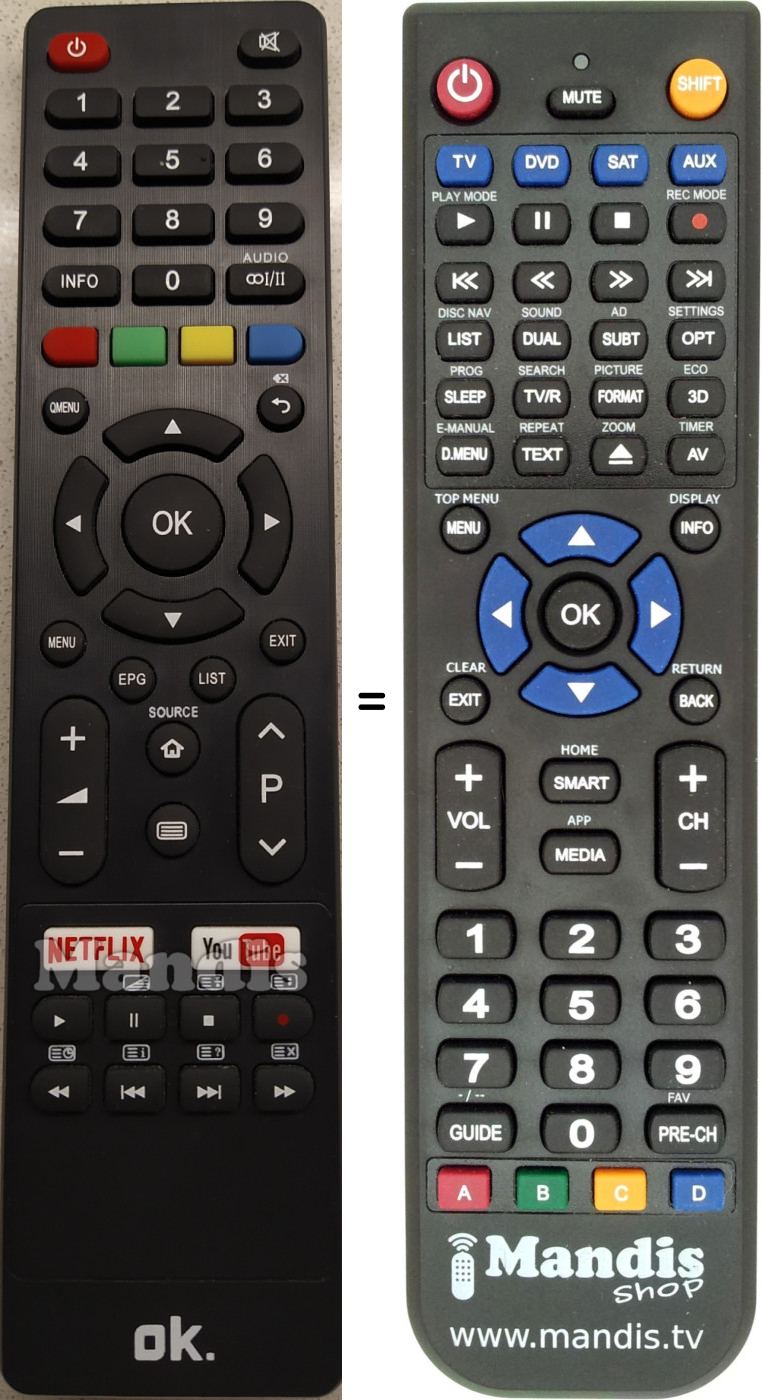 A continuació, us mostrarem la correspondència entre cada un dels botons del comandament original i el botó que realitza la mateixa funció en el comandament de substitució. En alguns casos, és possible que necessiti prémer la tecla SHIFT abans de prémer un altre botó per realitzar certes accions. Aquestes funcions addicionals sovint no s'utilitzen gaire i s'inclouen per facilitar la comprensió del comandament de substitució, o perquè el comandament original té més botons que el seu equivalent.